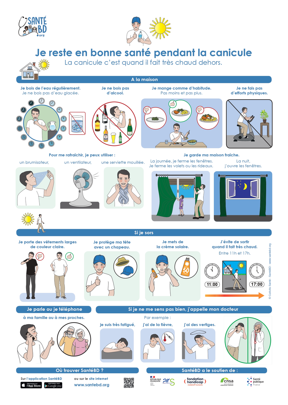 Les effets de la chaleur peuvent être : crampes, fatigue inhabituelle, maux de tête, fièvre > 38°C, vertiges et nausées, propos incohérents, etc.