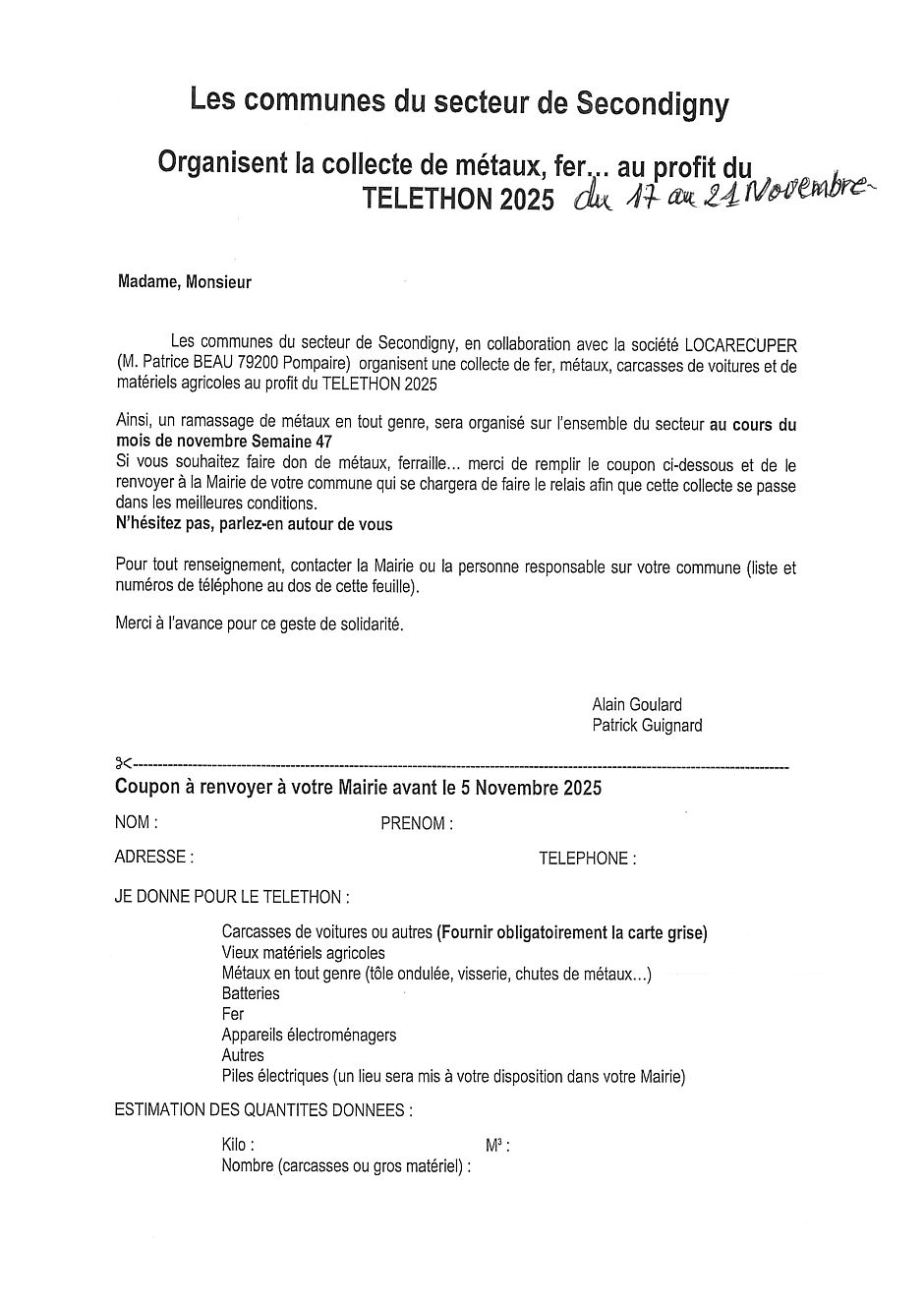 Du17nov.à21nov.Du 09:00 à 23:00 Ajouter à mon calendrierSolidaritéCollecte de métaux pour le TéléthonCollecte de métaux pour le Téléthon.Possibilité d'avoir des formulaires en mairiePrécédentRetour à la listeSuivant