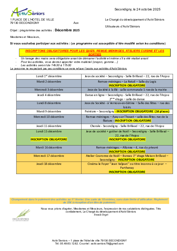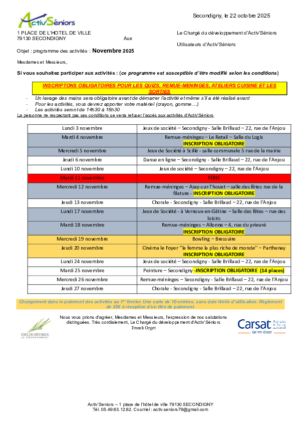 Horaires : Activités ludiques et culturelles du lundi au jeudi pour les personnes à la retraite sur le secteur de Secondigny ainsi qu’Allonne, Azay-sur-Thouet, le Retail, Vernoux-en-Gâtine, Pougne-Hérisson, La Boissière en Gâtine, Scillé.